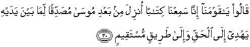 30. Mereka berkata: "Hai kaum kami, sesungguhnya kami telah mendengarkan kitab (Al Quran) yang telah diturunkan sesudah Musa yang membenarkan kitab-kitab yang sebelumnya lagi memimpin kepada kebenaran dan kepada jalan yang lurus.