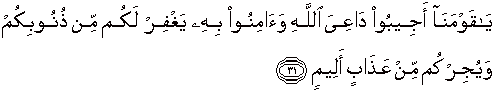 31. Hai kaum kami, terimalah (seruan) orang yang menyeru kepada Allah dan berimanlah kepada-Nya, niscaya Allah akan mengampuni dosa-dosa kamu
