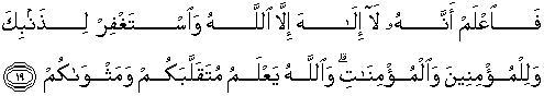 19. Maka ketahuilah, bahwa sesungguhnya tidak ada Ilah (sesembahan, tuhan) selain Allah dan mohonlah ampunan bagi dosamu dan bagi (dosa) orang-orang mukmin, laki-laki dan perempuan. Dan Allah mengetahui tempat kamu berusaha dan tempat kamu tinggal.