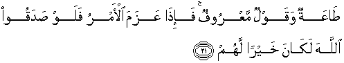 21. Ta'at dan mengucapkan perkataan yang baik (adalah lebih baik bagi mereka). Apabila telah tetap perintah perang (mereka tidak menyukainya). Tetapi jikalau mereka benar (imannya) terhadap Allah, niscaya yang demikian itu lebih baik bagi mereka.