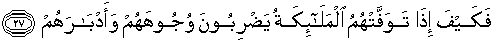 27. Bagaimanakah (keadaan mereka) apabila malaikat mencabut nyawa mereka seraya memukul-mukul muka mereka dan punggung mereka?