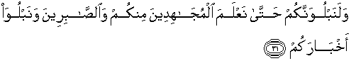 31. Dan sesungguhnya Kami benar-benar akan menguji kamu agar Kami mengetahui orang-orang yang berjihad dan bersabar di antara kamu, dan agar Kami menyatakan (baik buruknya) hal ihwalmu.
