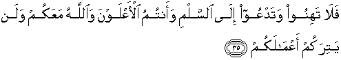 35. Janganlah kamu lemah dan minta damai padahal kamulah yang di atas dan Allah pun bersamamu dan Dia sekali-kali tidak akan mengurangi pahala amal-amalmu.