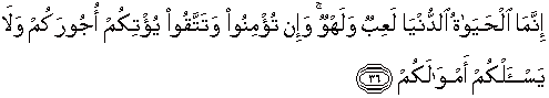 36. Sesungguhnya kehidupan dunia hanyalah permainan dan senda gurau. Dan jika kamu beriman dan bertakwa, Allah akan memberikan pahala kepadamu dan Dia tidak akan meminta harta-hartamu.