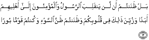 12. Tetapi kamu menyangka bahwa Rasul dan orang-orang mukmin tidak sekali-kali akan kembali kepada keluarga mereka selama-lamanya dan syaitan