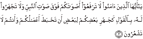 2. Hai orang-orang yang beriman, janganlah kamu meninggikan suaramu