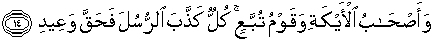 14. dan penduduk Aikah serta kaum Tubba' semuanya telah mendustakan rasul- rasul maka sudah semestinyalah mereka mendapat hukuman yang sudah diancamkan.
