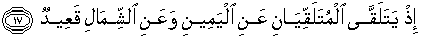 17. (yaitu) ketika dua orang malaikat mencatat amal perbuatannya, seorang duduk di sebelah kanan dan yang lain duduk di sebelah kiri.