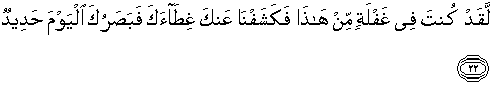 22. Sesungguhnya kamu berada dalam keadaan lalai dari (hal) ini, maka Kami singkapkan daripadamu tutup (yang menutupi) matamu, maka penglihatanmu pada hari itu amat tajam.