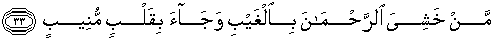 33. (Yaitu) orang yang takut kepada Tuhan Yang Maha Pemurah sedang Dia tidak kelihatan (olehnya) dan dia datang dengan hati yang bertaubat,