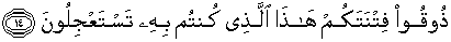 14. (Dikatakan kepada mereka): "Rasakanlah azabmu itu. Inilah azab yang dulu kamu minta untuk disegerakan."