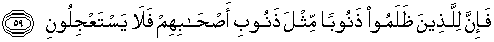 59. Maka sesungguhnya untuk orang-orang zalim ada bagian (siksa) seperti bahagian teman mereka (dahulu); maka janganlah mereka meminta kepada-Ku untuk menyegerakannya.