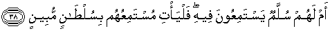 38. Ataukah mereka mempunyai tangga (ke langit) untuk mendengarkan pada tangga itu (hal-hal yang gaib)? Maka hendaklah orang yang mendengarkan di antara mereka mendatangkan suatu keterangan yang nyata.