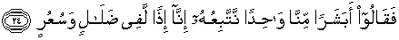 24. Maka mereka berkata: "Bagaimana kita akan mengikuti seorang manusia (biasa) di antara kita?" Sesungguhnya kalau kita begitu benar-benar berada dalam keadaan sesat dan gila."