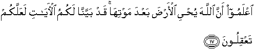 17. Ketahuilah olehmu bahwa sesungguhnya Allah menghidupkan bumi sesudah matinya. Sesungguhnya Kami telah menjelaskan kepadamu tanda-tanda kebesaran (Kami) supaya kamu memikirkannya.
