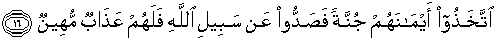 16. Mereka menjadikan sumpah-sumpah mereka sebagai perisai, lalu mereka halangi (manusia) dari jalan Allah; karena itu mereka mendapat azab yang menghinakan.