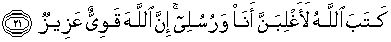 21. Allah telah menetapkan: "Aku dan rasul-rasul-Ku pasti menang." Sesungguhnya Allah Maha Kuat lagi Maha Perkasa.