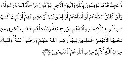 22. Kamu tak akan mendapati kaum yang beriman pada Allah dan hari akhirat,