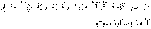 4. Yang demikian itu adalah karena Sesungguhnya mereka menentang Allah dan Rasul-Nya. Barangsiapa menentang Allah dan Rasul-Nya, Sesungguhnya Allah sangat keras hukuman-Nya.