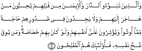 hati mereka terhadap apa-apa yang diberikan kepada mereka (Muhajirin); dan mereka mengutamakan (orang-orang Muhajirin), atas