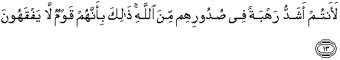 13. Sesungguhnya kamu dalam hati mereka lebih ditakuti daripada Allah. Yang demikian itu karena mereka adalah kaum yang tidak mengerti.