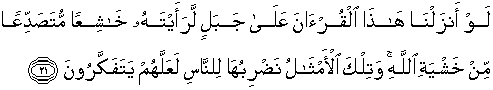 21. Kalau sekiranya Kami turunkan Al-Quran ini kepada sebuah gunung, pasti kamu akan melihatnya tunduk terpecah belah disebabkan ketakutannya kepada Allah. Dan perumpamaan-perumpamaan itu Kami buat untuk manusia supaya mereka berfikir.