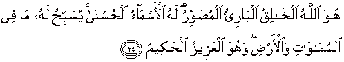 24. Dialah Allah Yang Menciptakan, Yang Mengadakan, Yang Membentuk Rupa, Yang Mempunyai Asmaaul Husna. Bertasbih kepadaNya apa yang di langit dan bumi. Dan Dialah Yang Maha Perkasa lagi Maha Bijaksana.
