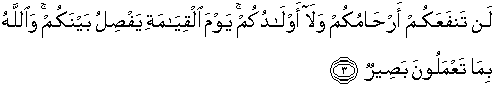 3. Karib kerabat dan anak-anakmu sekali-sekali tiada bermanfaat bagimu pada Hari Kiamat. Dia akan memisahkan antara kamu. Dan Allah Maha Melihat apa yang kamu kerjakan.