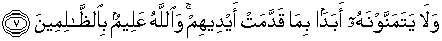 7. Mereka tiada akan mengharapkan kematian itu selama-lamanya disebabkan kejahatan yang telah mereka perbuat dengan tangan mereka sendiri. Dan Allah Maha Mengetahui akan orang-orang yang zalim.