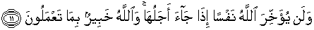 11. Dan Allah sekali-kali tidak akan menangguhkan (kematian) seseorang apabila telah datang waktu kematiannya. Dan Allah Maha Mengenal apa yang kamu kerjakan.