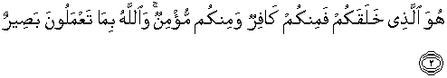 2. Dia-lah yang menciptakan kamu maka di antara kamu ada yang kafir dan di antaramu ada yang mukmin. Dan Allah Maha Melihat apa yang kamu kerjakan.