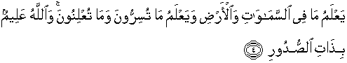 4. Dia mengetahui apa yang ada di langit dan di bumi dan mengetahui apa yang kamu rahasiakan dan yang kamu nyatakan. Dan Allah Maha Mengetahui segala isi hati.