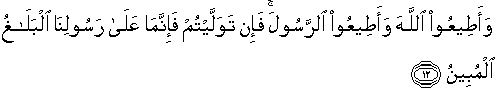 12. Dan taatlah kepada Allah dan taatlah kepada Rasul-Nya, jika kamu berpaling sesungguhnya kewajiban Rasul Kami hanyalah menyampaikan (amanat Allah) dengan terang.