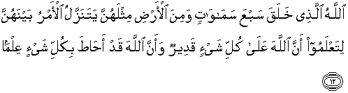 12. Allah-lah yang menciptakan tujuh langit dan seperti itu pula bumi. Perintah Allah berlaku padanya, agar kamu mengetahui bahwasanya Allah Maha Kuasa atas segala sesuatu, dan sesungguhnya Allah ilmu-Nya benar-benar meliputi segala sesuatu.