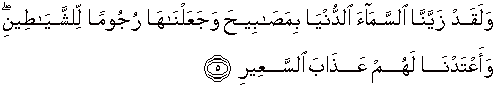 5. Sesungguhnya Kami telah menghiasi langit yang dekat dengan bintang-bintang, dan Kami jadikan bintang-bintang itu alat-alat pelempar syaitan, dan Kami sediakan bagi mereka siksa neraka yang menyala-nyala.