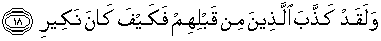 18. Dan sesungguhnya orang-orang yang sebelum mereka telah mendustakan (rasul-rasul-Nya). Maka alangkah hebatnya kemurkaan-Ku.