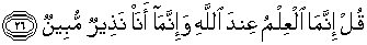 26. Katakanlah: "Sesungguhnya ilmu (tentang hari kiamat itu) hanya pada sisi Allah. Dan sesungguhnya aku hanyalah seorang pemberi peringatan yang menjelaskan."