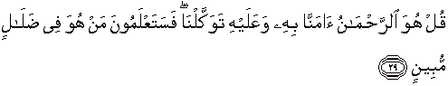 29. Katakanlah: "Dia-lah Allah Yang Maha Penyayang kami beriman kepada-Nya dan kepada-Nya-lah kami bertawakkal. Kelak kamu akan mengetahui siapakah yang berada dalam kesesatan yang nyata."