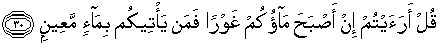 30. Katakanlah: "Terangkanlah kepadaku jika sumber air kamu menjadi kering; maka siapakah yang akan mendatangkan air yang mengalir bagimu?."