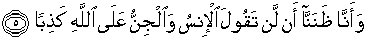 5. dan sesungguhnya kami mengira, bahwa manusia dan jin sekali-kali tidak akan mengatakan perkataan yang dusta terhadap Allah.