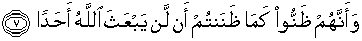 7. Dan sesungguhnya mereka (jin) menyangka sebagaimana persangkaan kamu (orang-orang kafir Mekah), bahwa Allah sekali-kali tidak akan membangkitkan seorang (rasul)pun,
