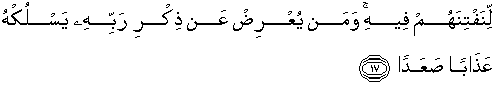 17. Untuk Kami beri cobaan kepada mereka padanya. Dan barangsiapa yang berpaling dari peringatan Tuhannya, niscaya akan dimasukkan-Nya ke dalam azab yang amat berat.