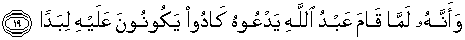19. Dan bahwasanya tatkala hamba Allah (Muhammad) berdiri menyembah-Nya (mengerjakan ibadat), hampir saja jin-jin itu desak mendesak mengerumuninya.