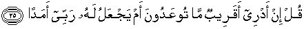 25. Katakanlah: "Aku tidak mengetahui, apakah azab yang diancamkan kepadamu itu dekat ataukah Tuhanku menjadikan bagi (kedatangan) azab itu masa yang panjang?."