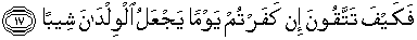 17. Maka bagaimanakah kamu akan dapat memelihara dirimu jika kamu tetap kafir kepada hari yang menjadikan anak-anak beruban.