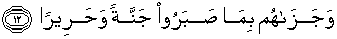 12. Dan Dia memberi balasan kepada mereka karena kesabaran mereka (dengan) surga dan (pakaian) sutera,