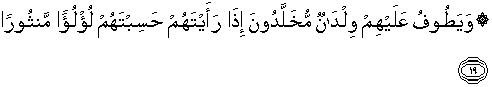 19. Dan mereka dikelilingi oleh pelayan-pelayan muda yang tetap muda. Apabila kamu melihat mereka, kamu akan mengira mereka, mutiara yang bertaburan.
