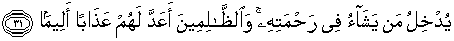 31. Dan memasukkan siapa yang dikehendakiNya ke dalam rahmat-Nya (surga). Dan bagi orang-orang zalim disediakan-Nya azab yang pedih.