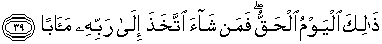 39. Itulah hari yang pasti terjadi. Maka barangsiapa yang menghendaki, niscaya ia menempuh jalan kembali kepada Tuhannya.