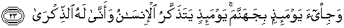 23. Dan pada hari itu diperlihatkan neraka Jahannam; dan pada hari itu ingatlah manusia, akan tetapi tidak berguna lagi mengingat itu baginya.